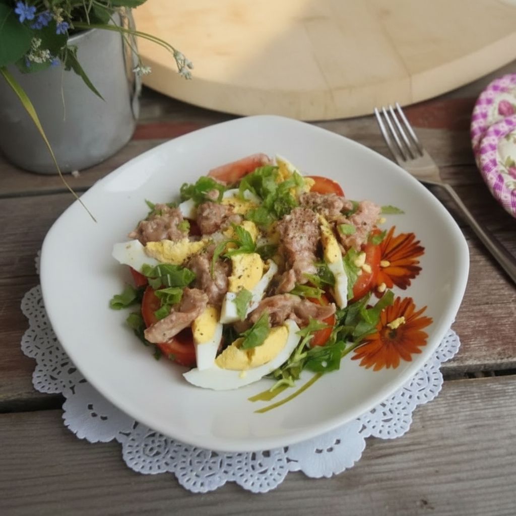 Мы иногда готовим этот салат на семейные ужины — он лёгкий, но при этом сытный, и всегда съедается до последней ложки.