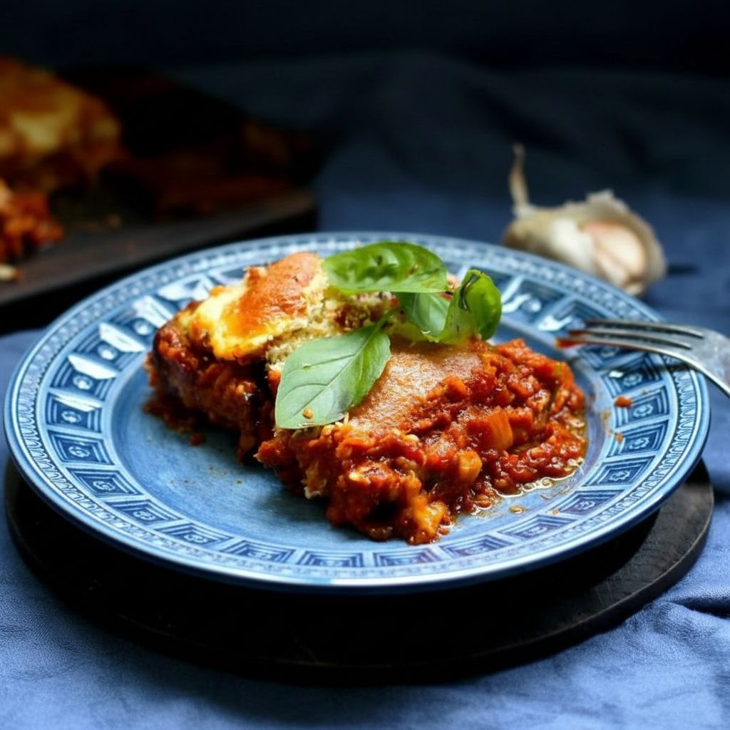 Равномерно распределите сверху помидорно-сырную смесь. Разогрейте духовку до 180°C и запекайте около 30 минут, пока поверхность не станет золотистой. По настроению можно подать это блюдо с чем-то сливочным и нежным, например с грибным жульеном.